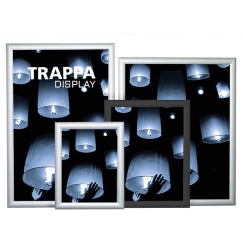 Trappa Poster Frames feature snap-edges, which easily open from the front to allow for quick and easy, graphic changes with no tools required. This sleek framing system features a set of spring-loaded aluminum extrusions mounted to a high-impact polystyrene backer, and frames are available in a variety of sizes and in black or silver finishes. All frames come standard with clear non-glare lens, fully assembled, and ready to hang. Custom sizes are also available.