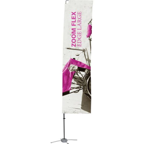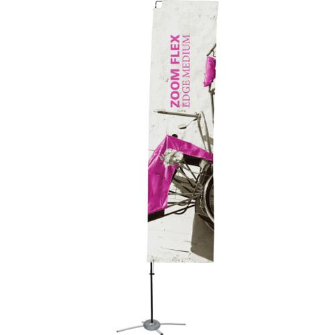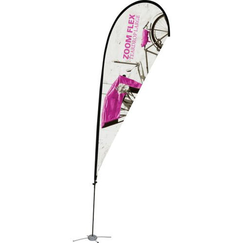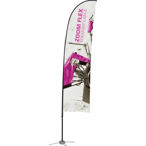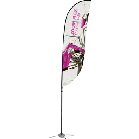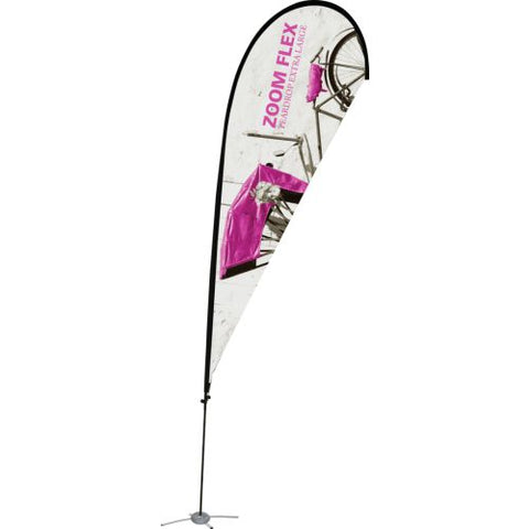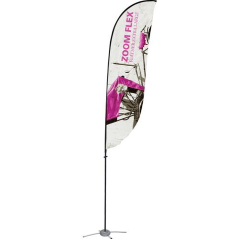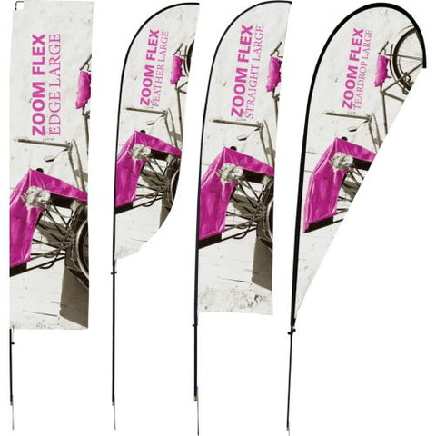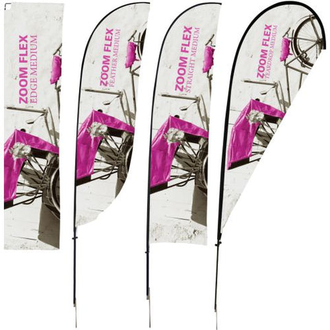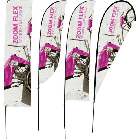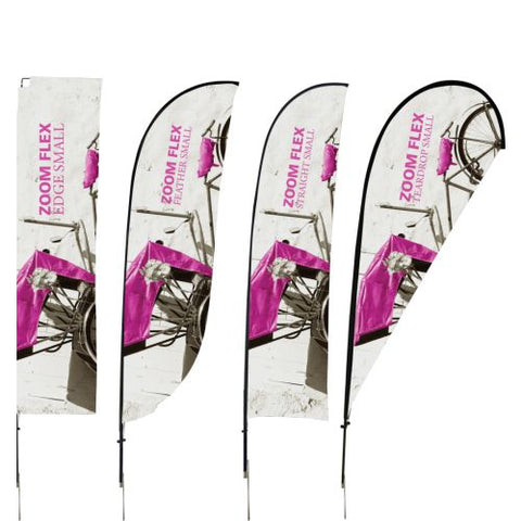 The Zoom Flex Small, Medium, Large and Extra Large Flag features a full fiber pole and wind-resistant flag. For indoor or outdoor use, the flexible, design allows the graphic to rotate in the wind. The Zoom Flex Small Flag comes in your choice of single or double-sided and is offered in four shapes - Feather, Straight, Teardrop and Edge. Heights vary based on flag shape. Ground stake and storage bag included.